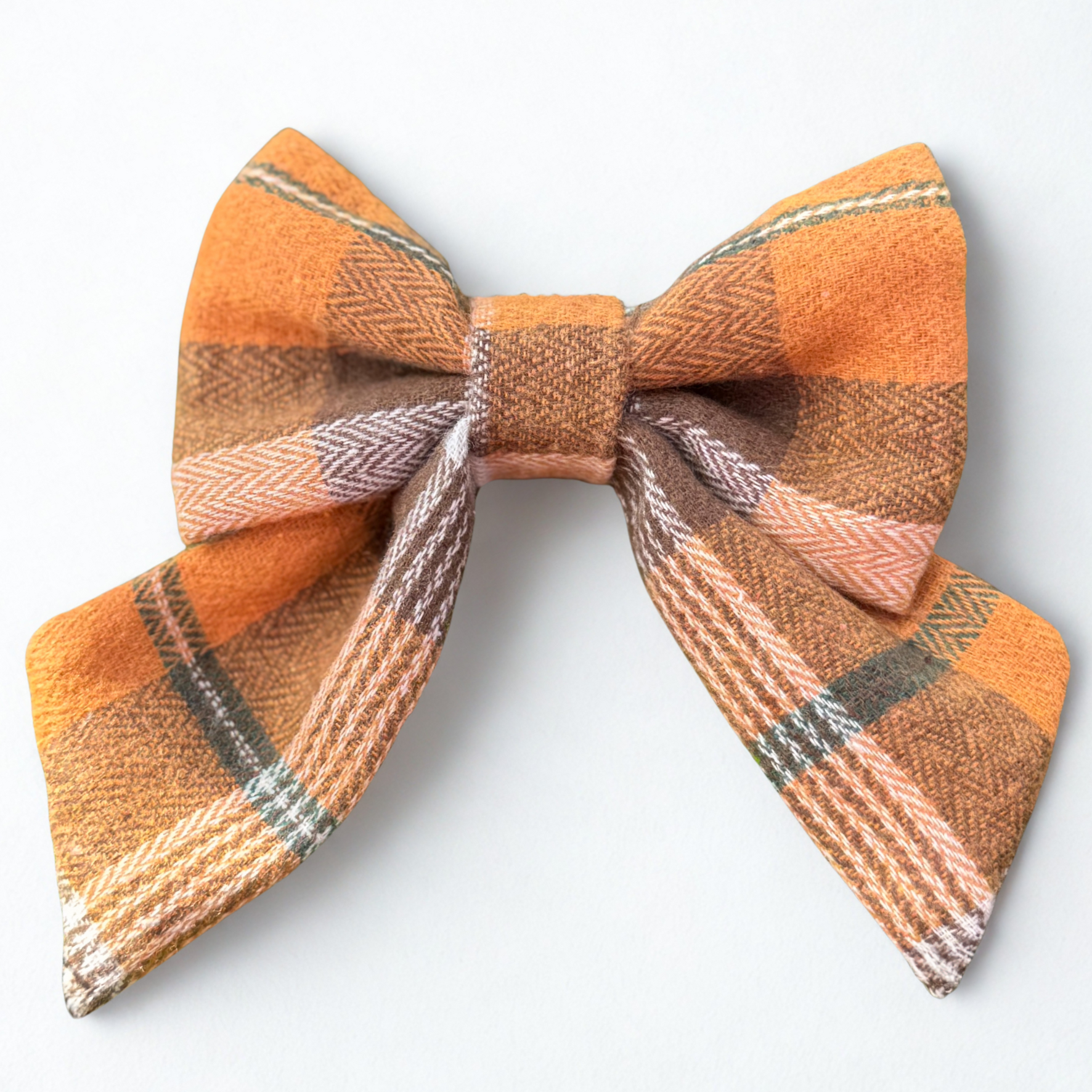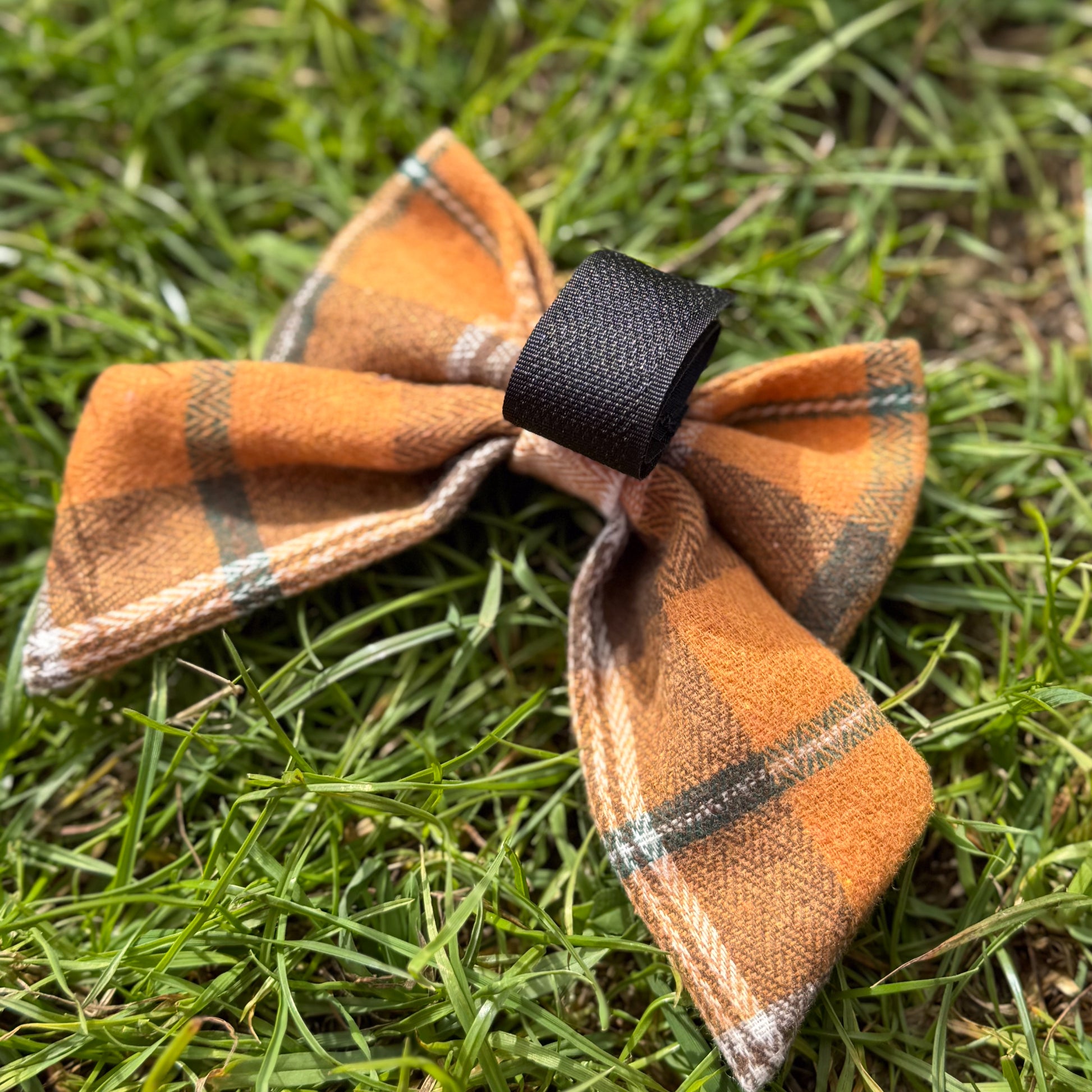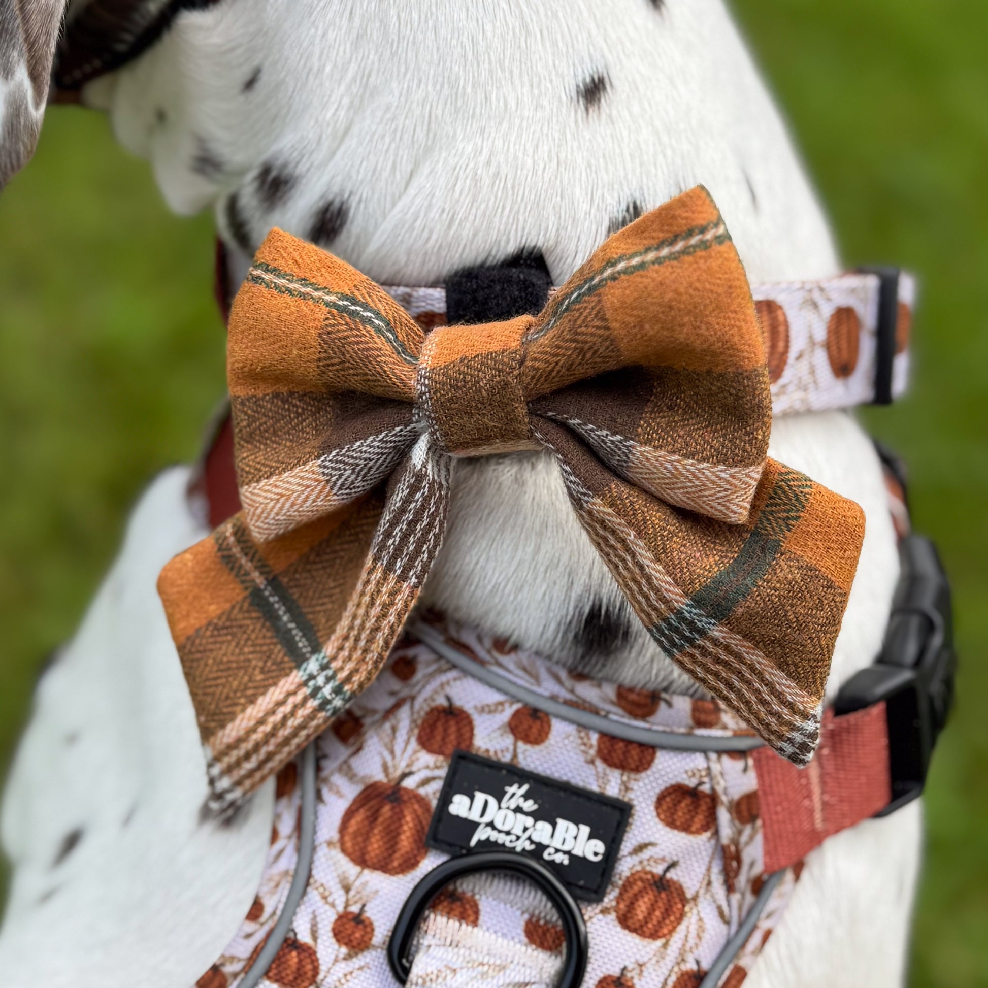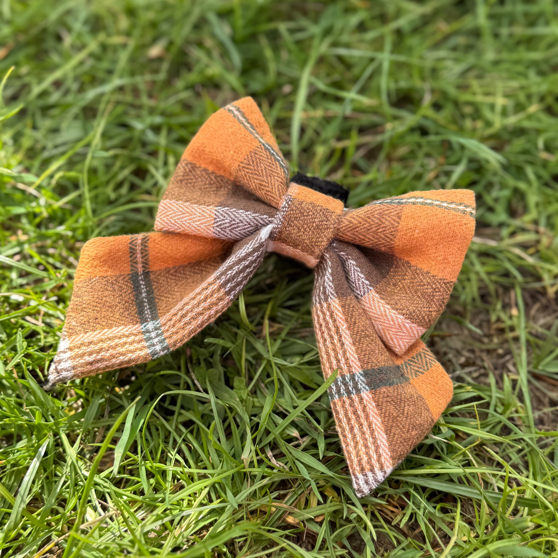 The bow features a classic orange-and-brown check pattern with subtle accents of green and cream, giving it a cozy, seasonal feel. The material is lightweight yet structured enough to hold its shape, making it both stylish and practical for pups. Perfect for fall walks, pumpkin patch outings, or festive photoshoots.