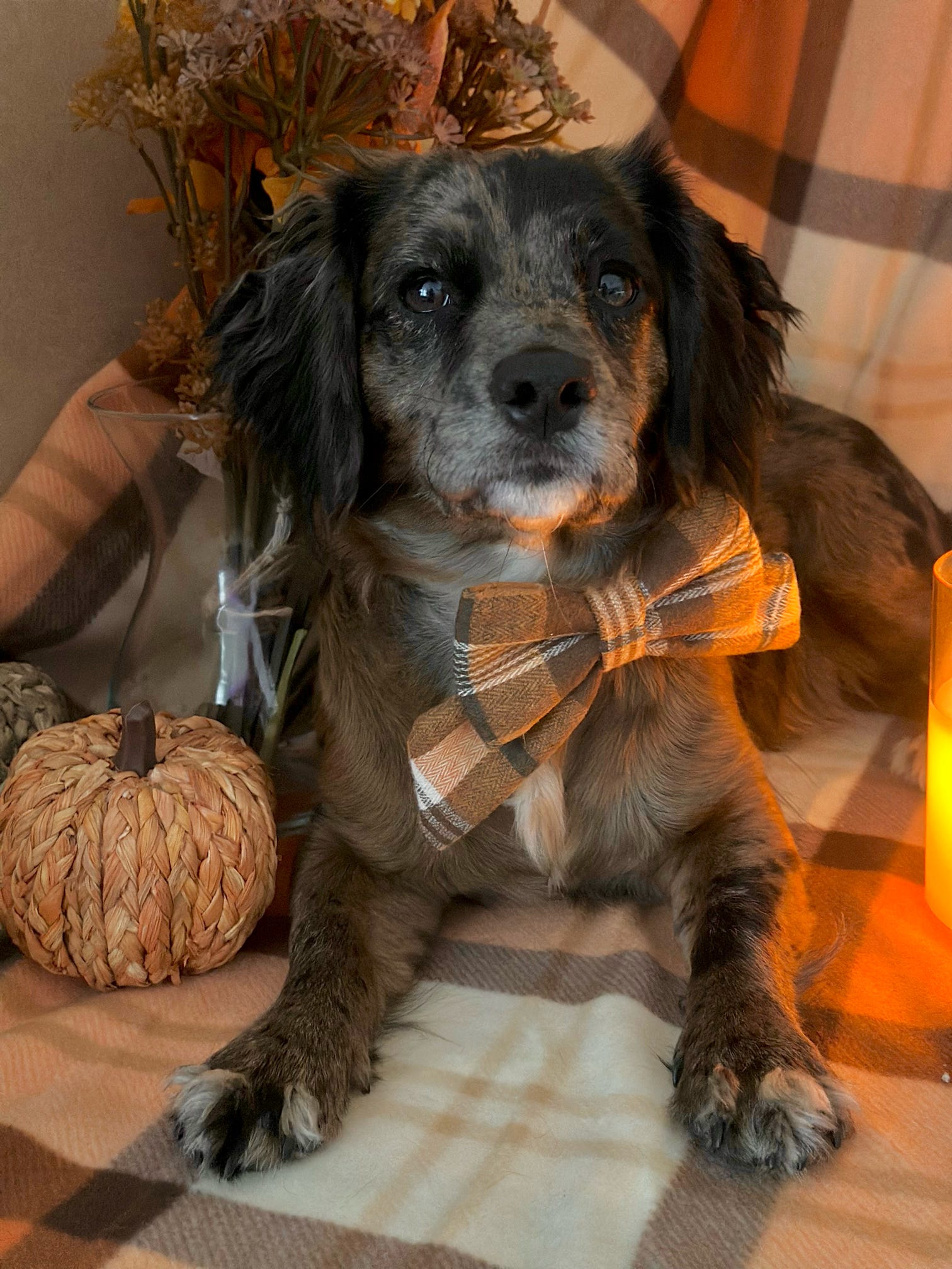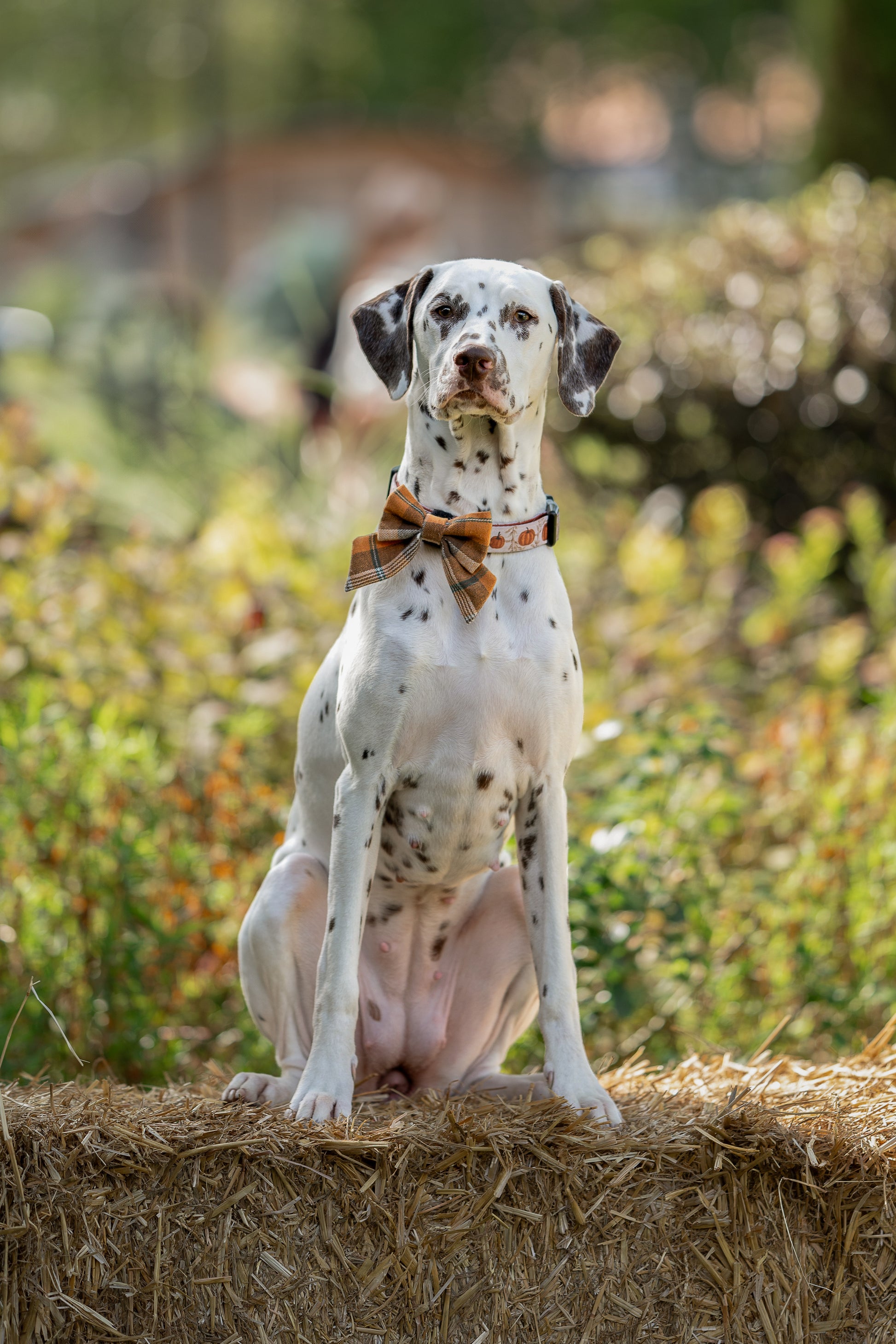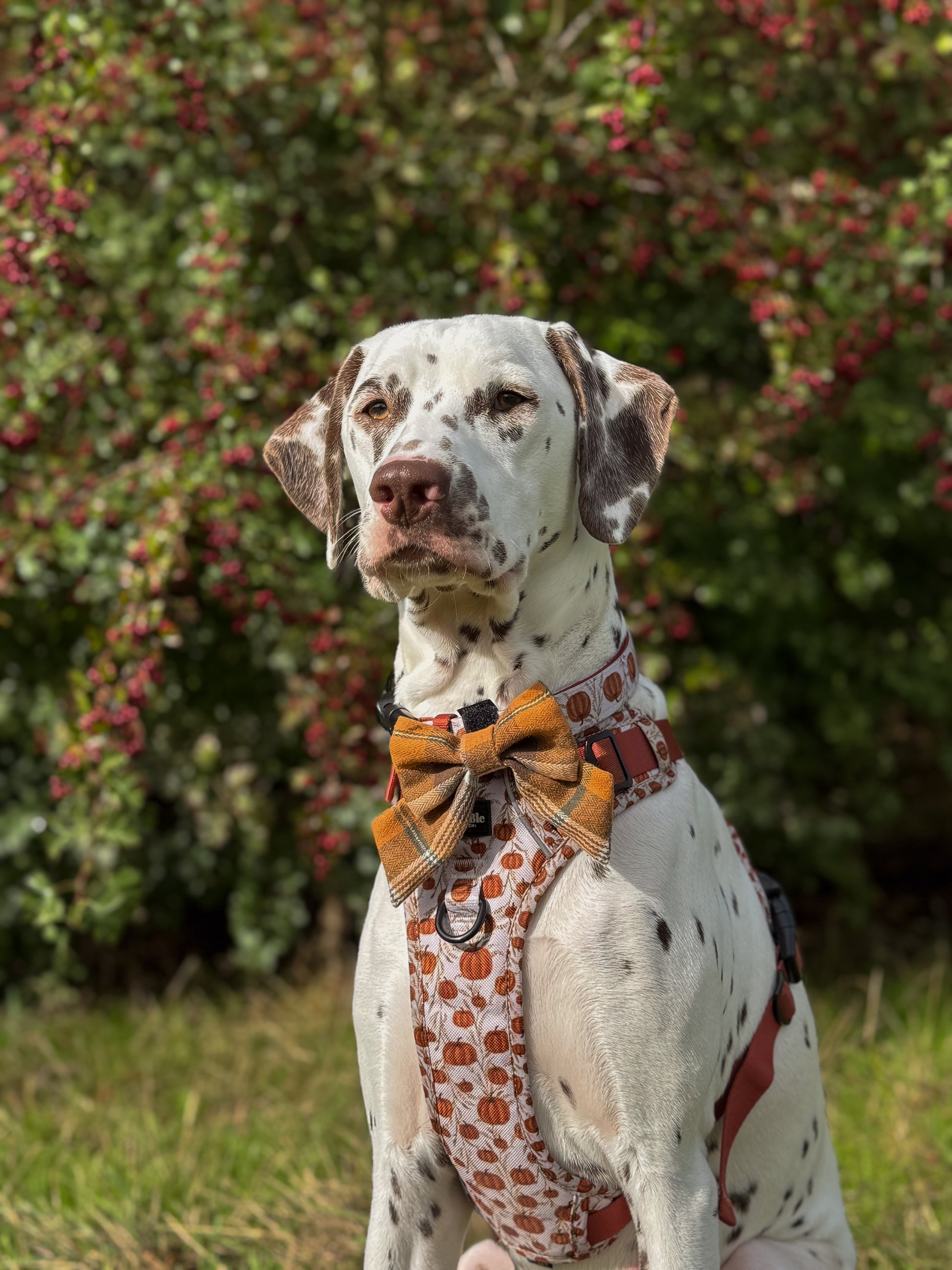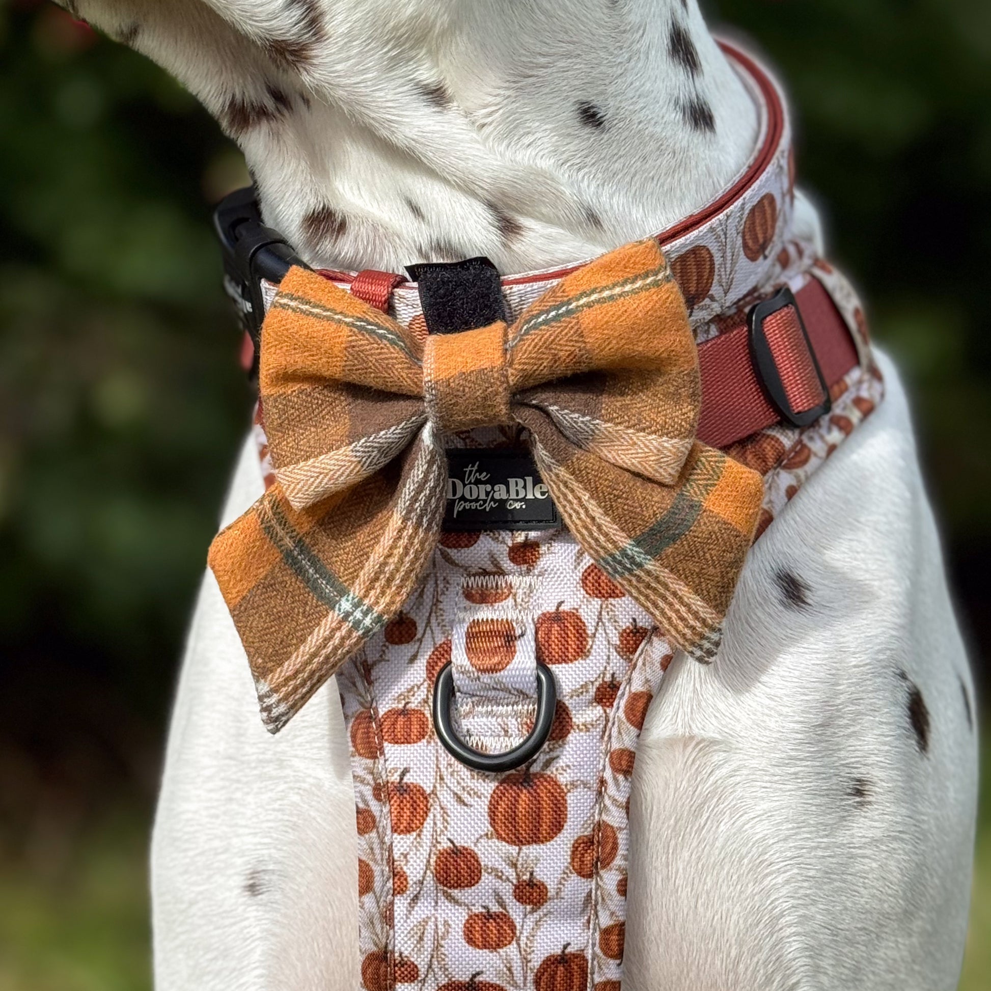 The bow features a classic orange-and-brown check pattern with subtle accents of green and cream, giving it a cozy, seasonal feel. The material is lightweight yet structured enough to hold its shape, making it both stylish and practical for pups. Perfect for fall walks, pumpkin patch outings, or festive photoshoots.